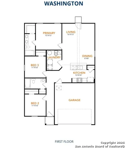 MLS# - Built by NHC - Feb 2026 completion! ~ The Washington Plan from our Liberty Series is a thoughtfully designed single-story home featuring 3 bedrooms, 2 bathrooms, a 2-car garage, and 1,209 square feet of functional living space. As you step inside, you'll find two secondary bedrooms and a full bathroom conveniently located at the front of the home. Continue into the bright and open living area, where the kitchen with a central island seamlessly overlooks the dining area and family room, creating a perfect space for everyday living and entertaining. The laundry room is thoughtfully situated off the kitchen for easy access. The primary bedroom, located at the back of the home for added privacy, features a private bathroom and a walk-in closet, providing a comfortable retreat. .