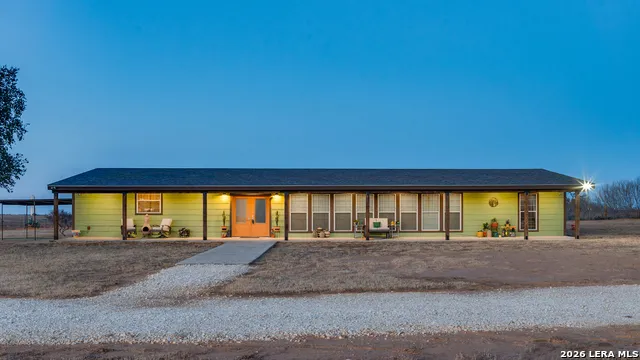 Set on 20.28 wide-open acres of peaceful Texas country living, this all-one-level home is the kind of place that makes you slow down and breathe. Inside, you won't find carpet anywhere, just beautiful commercial-grade vinyl flooring and ceramic tile throughout. You will absolutely fall in love with the dream kitchen complete with quartz countertops, a massive 15-foot kitchen island, true farmhouse style sink, cooktop, stainless steel appliances, and a Bosch oven that any home chef will appreciate. Natural light pours in through the abundance of windows highlighting the clean lines and beautiful rustic finishes. The oversized laundry room is a standout feature with hanging racks and generous closet storage that was designed for easy day to day living. Soak your troubles away in claw bath tub or enjoy your gorgeous walk-in tiled shower. Outside is where it really shines, with a 75-foot covered front & back porch perfect for taking in breathtaking sunsets, watching wildlife wander by, and enjoying fields of bluebonnets and Indian paintbrush flowers. A rock path leads to a quiet sitting area surrounded by native Texas cactus, making this property equal parts comfort, style, and serene country charm. Property is fully fenced surrounded by coastal hay, with "seasonal" pond and 40x50 pole barn perfect for chicken coop, storing a boat, RV or whatever toys you've got! Plenty of room to spread out and enjoy some Texas BBQ and sip on a glass of cool ice tea while taking in this wide open views. The seller has taken great care of the home and is offering it as-is simply reflecting the excellent under market value of owning a dream home on 20+ acres.